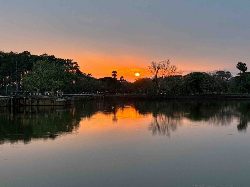HOME旅行 アンコールワットからの夕日鑑賞 2026-04-10 旅行 海外 18時ごろ、アンコールワットを背にしてリフレクティング池の方角、西の方に向くと夕陽を見ることができます。 この日は、雲が多く、夕陽を見るのは絶望的でしたが、なんとか見ることができました。 写真の左に見えるているのがレインボーブリッジです。 世界遺産 アンコールワット ベン・メリア遺跡