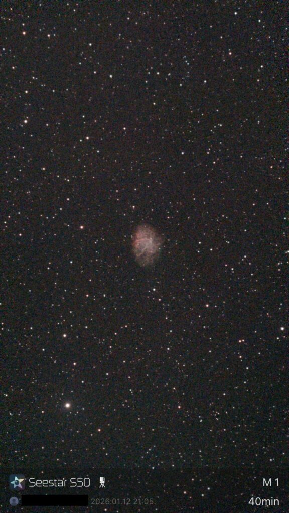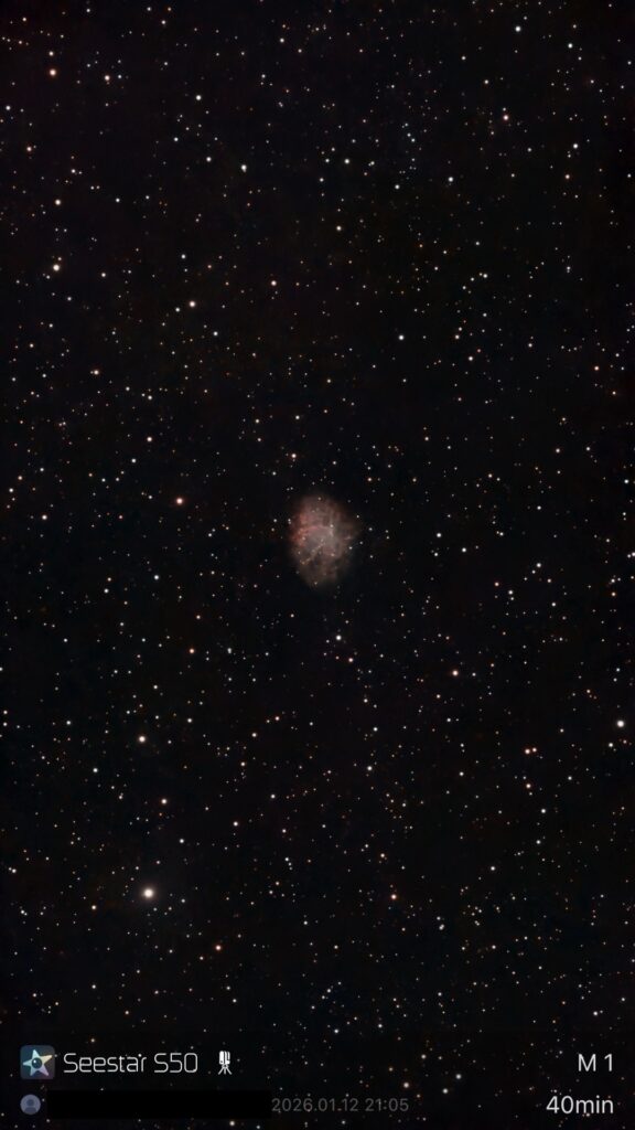 - まずはM1(かに星雲)。40分露出するとかなり星雲の模様がはっきりしますね。