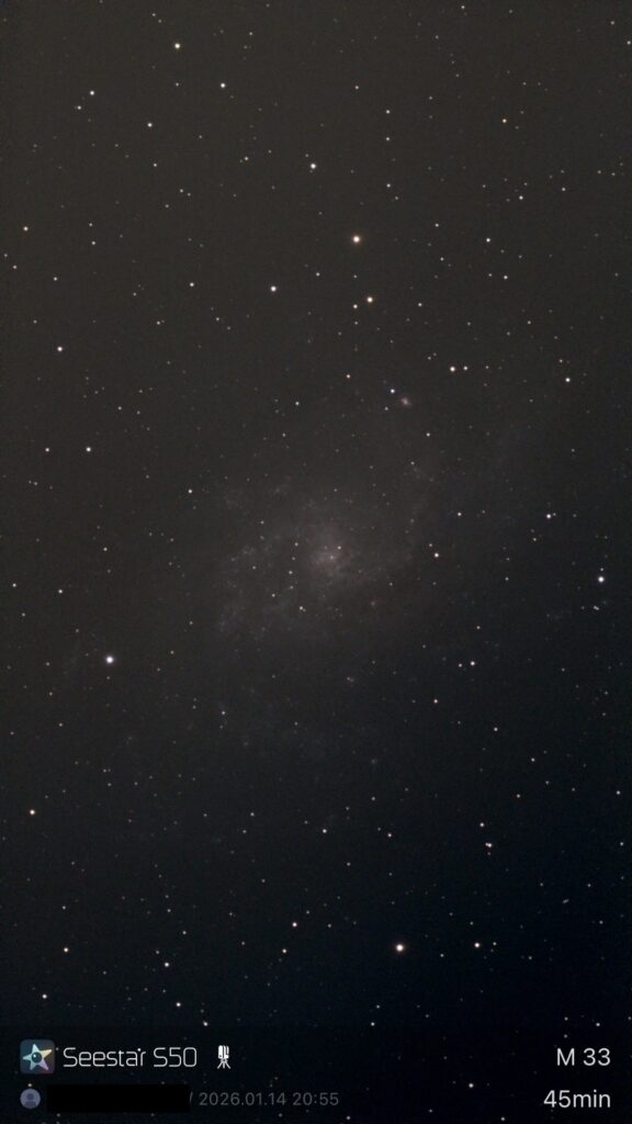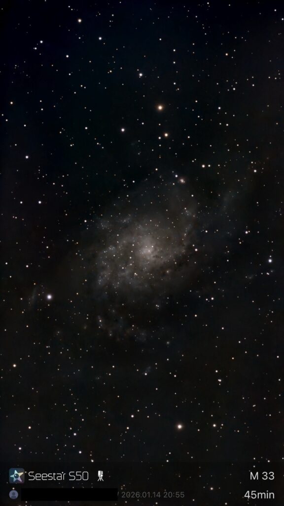 3. M33(さんかく座銀河)です。NGC2403と同様にdenoiseすると渦巻きがよくわかります。
