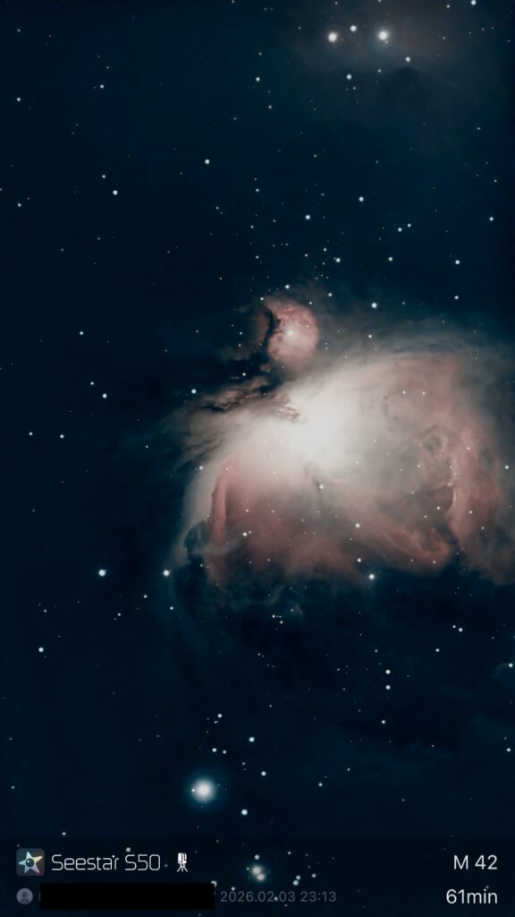 7. M42(オリオン大星雲)です。いつも15分程度で綺麗な写真が撮れてしまうので長時間露出したことがなかったのですが、今回は61分露出しました。denoiseするとdenoise前とは違ったいい写真となりました。