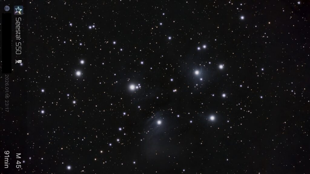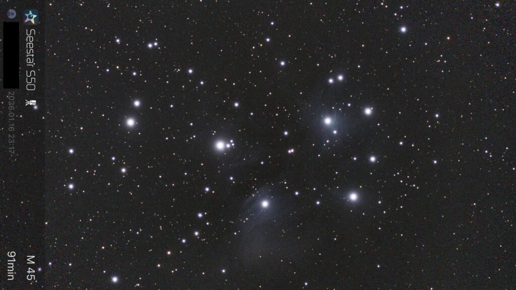 5. M45(プレアデス星団、スバル)です。スバル自動車のロゴ、六連星と並べてみましたが、星の位置がどう一致するのか悩みます。