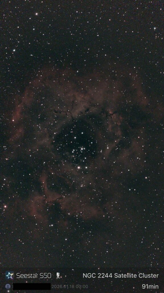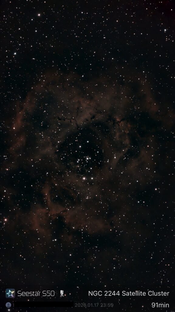 6. NGC2244(ばら星雲)です。91分露出しましたが、やはり街中での撮影のためか星雲の発色が弱いです。